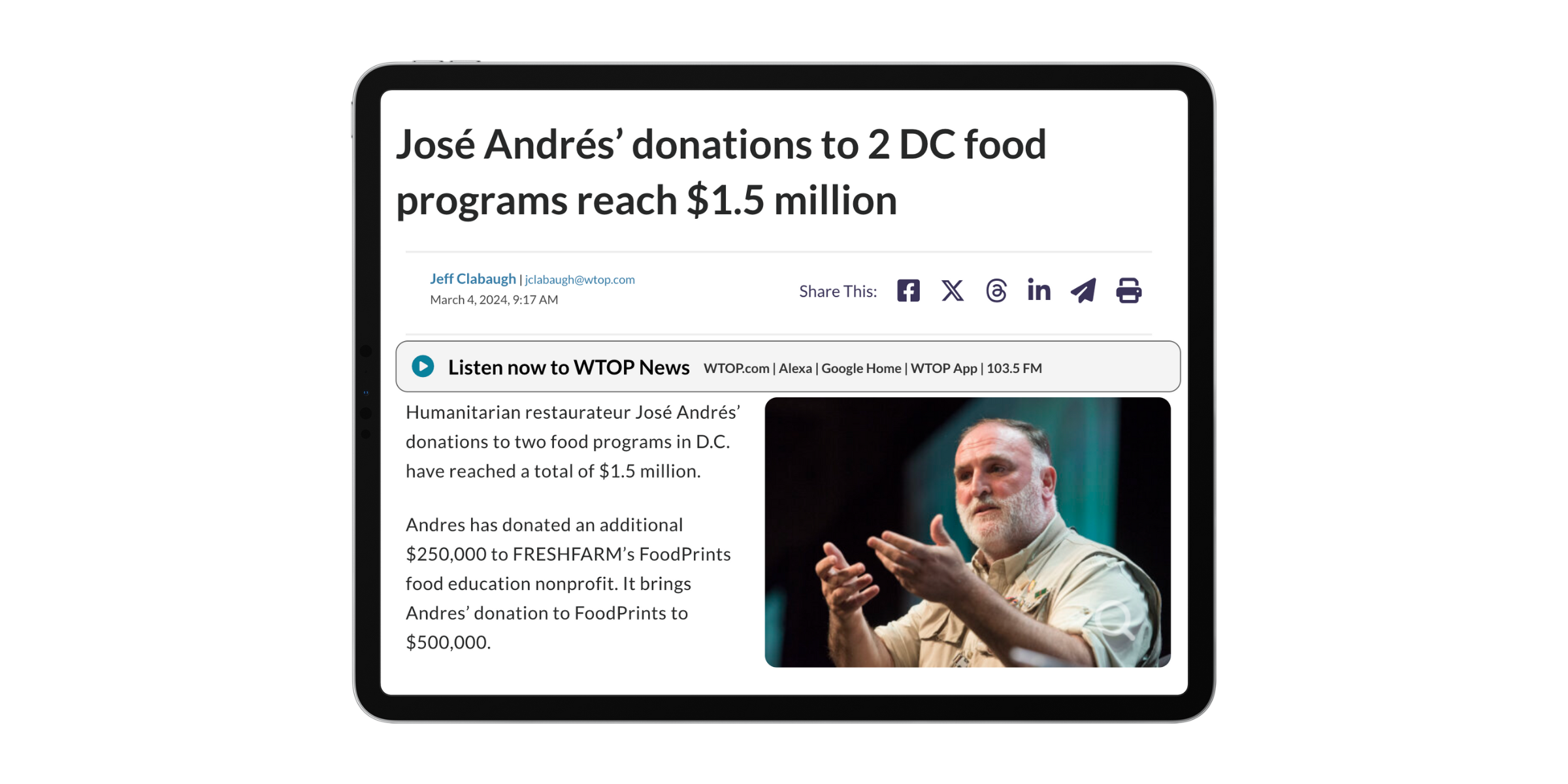 7Deadly has provided all-hands PR support for FRESHFARM, starting with Mikala’s role on the non-profit’s Advocacy Council. We lent a PR hand to help them streamline their operational PR efforts and achieve greater visibility. 7Deadly created a steady cadence of submissions to high-impact leadership awards and enhanced their engagement with the farmer community. By leveraging strategic communication techniques and fostering strong relationships, 7Deadly amplified FRESHFARM's mission and successes within the nonprofit, food, and education sectors.
